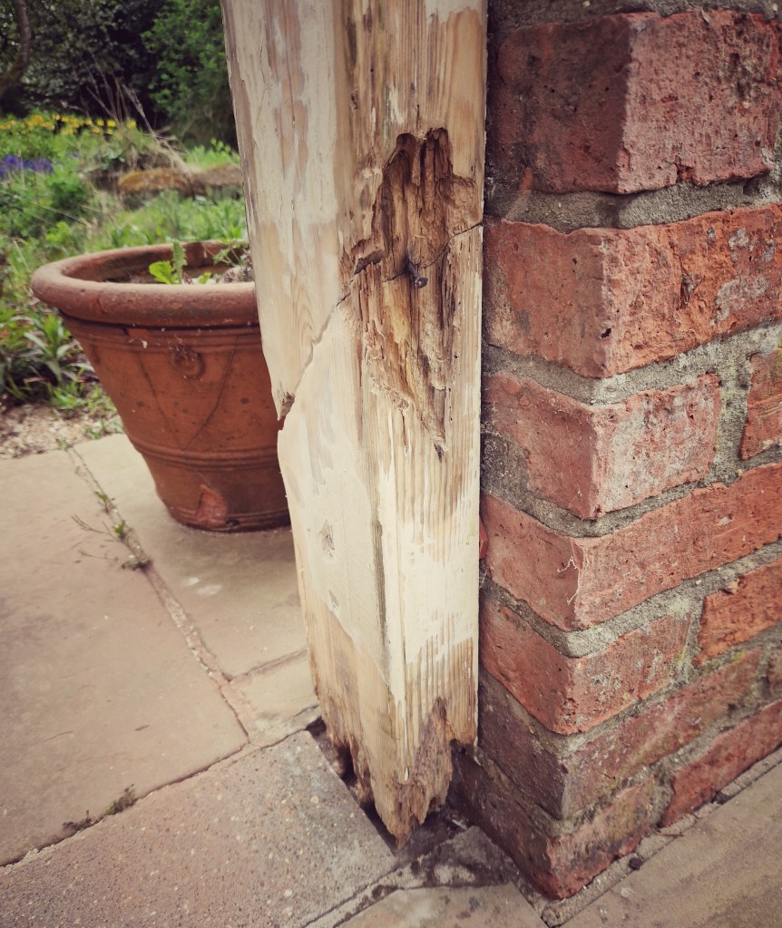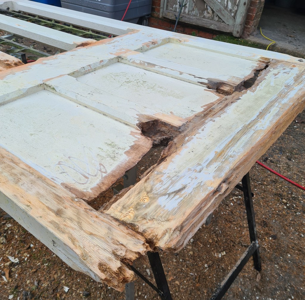 As well as the gate the frame was also in poor condition and I could start to repair this whilst the gate was still in the workshop curing. You will see from the photos the frame had been previously repaired with new timber and the splicing line that had failed allowing water in and rot to develop.