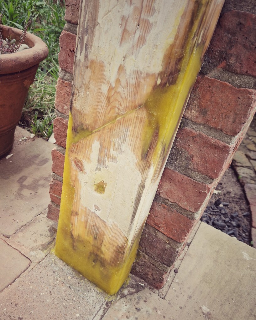 After the messy job of stripping the gate down outside it was time to get it into the workshop and get on with the repairs. Once all the rot was removed and paint sanded down all of the areas to be repaired were prepped with Repair Care Dry Fix Uni to stabilise the remaining wood and provide a good substrate for the resin to bond to.