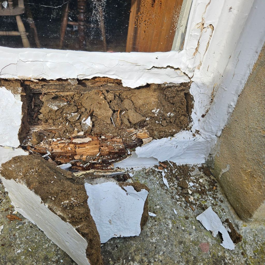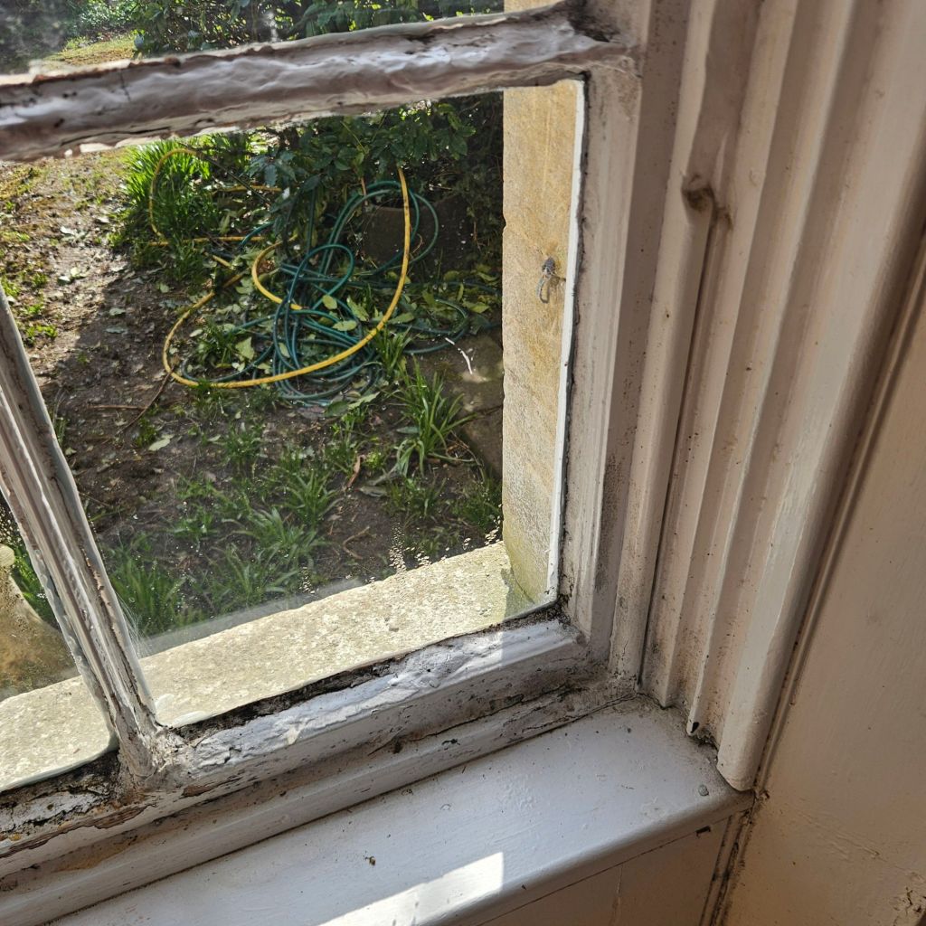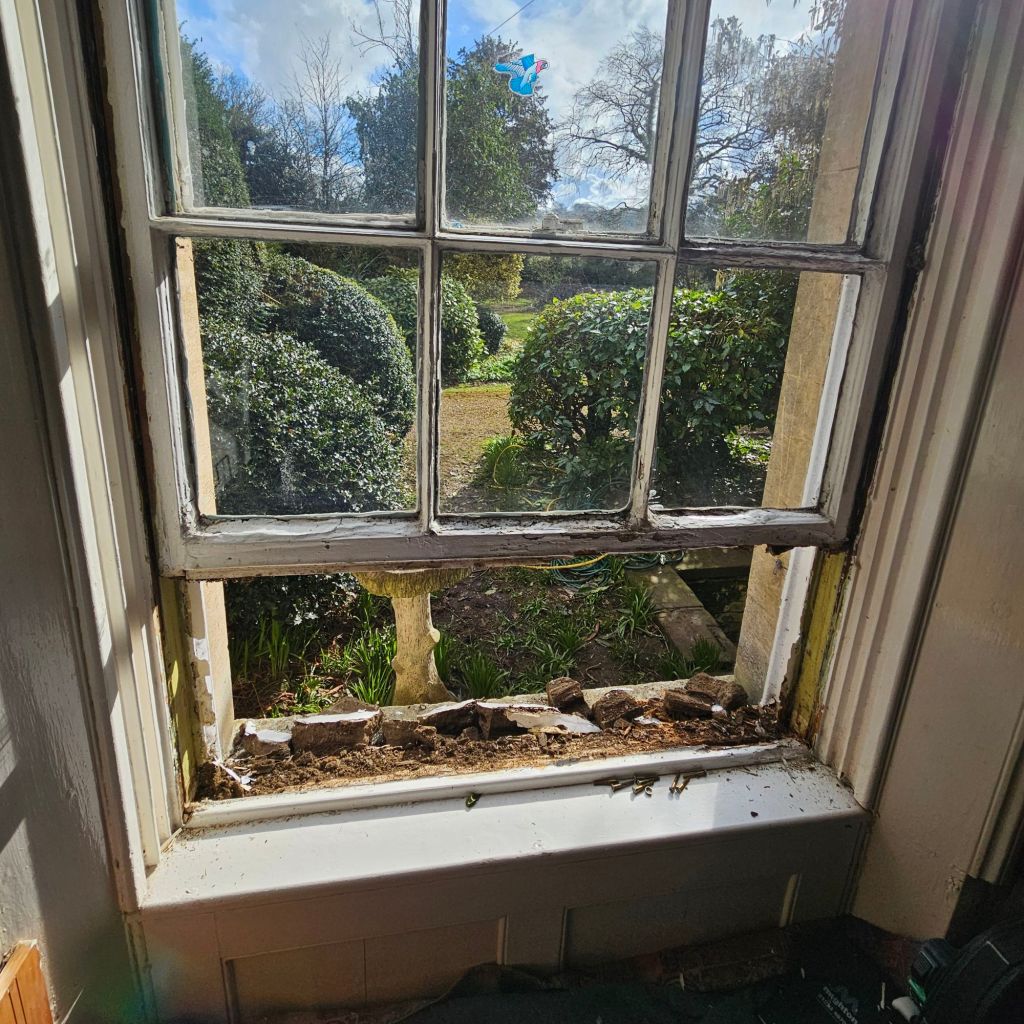 The lower section of the window was in an atrocious state. The sill had collapsed, the glazing bars were crumbling, and the original timber had been replaced in places with what can only be described as… mud and paint. The photos tell the story better than I can: huge chunks of failed filler falling away, wet rot right through the lower sash bottom rail, and a sash that wouldn’t have moved even if you begged it.