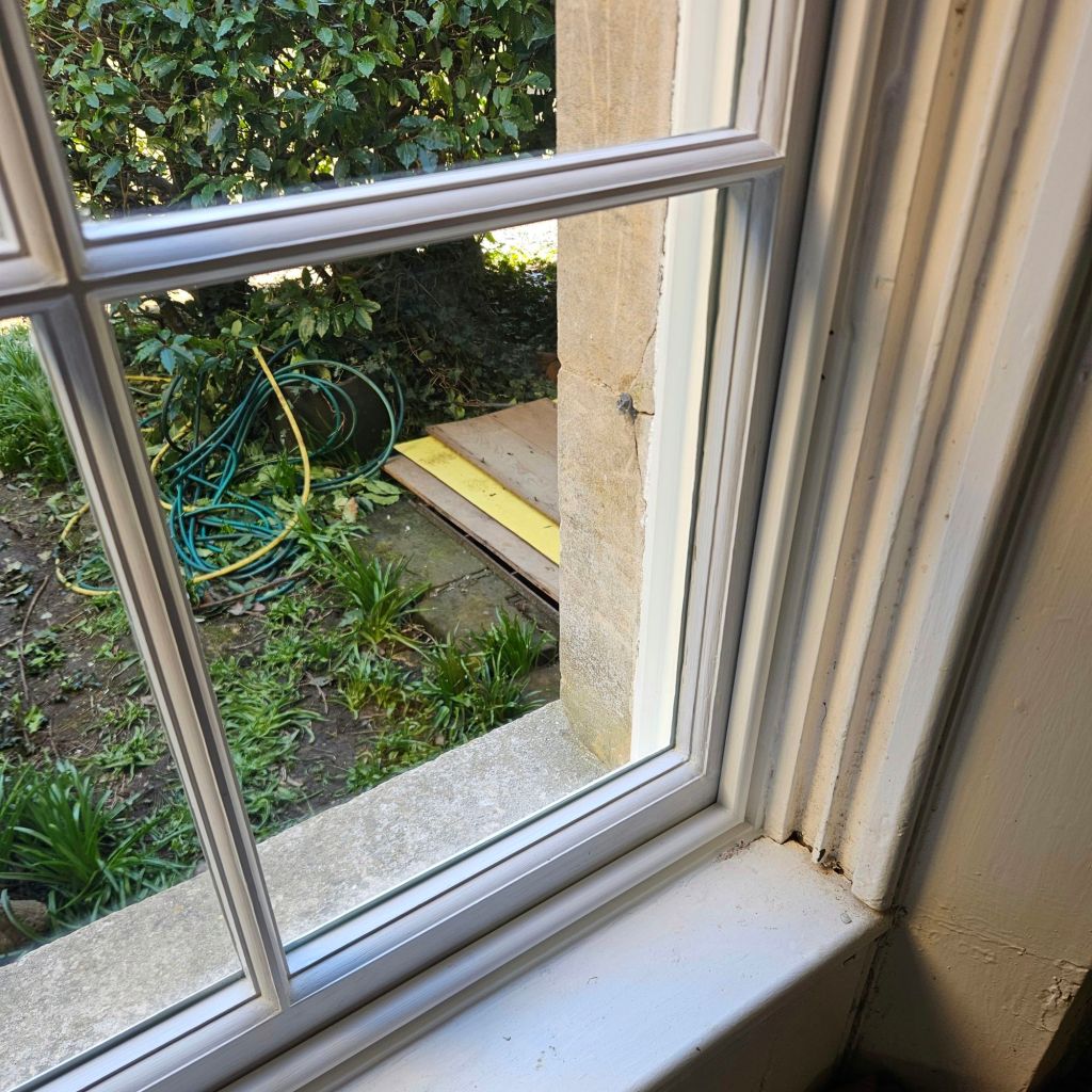 Once the repairs were complete, both sashes were reinstalled into the box frame, fully re-corded, and balanced. I fitted discreet draught proofing throughout, so the window now opens smoothly, closes softly, and seals properly against cold air.