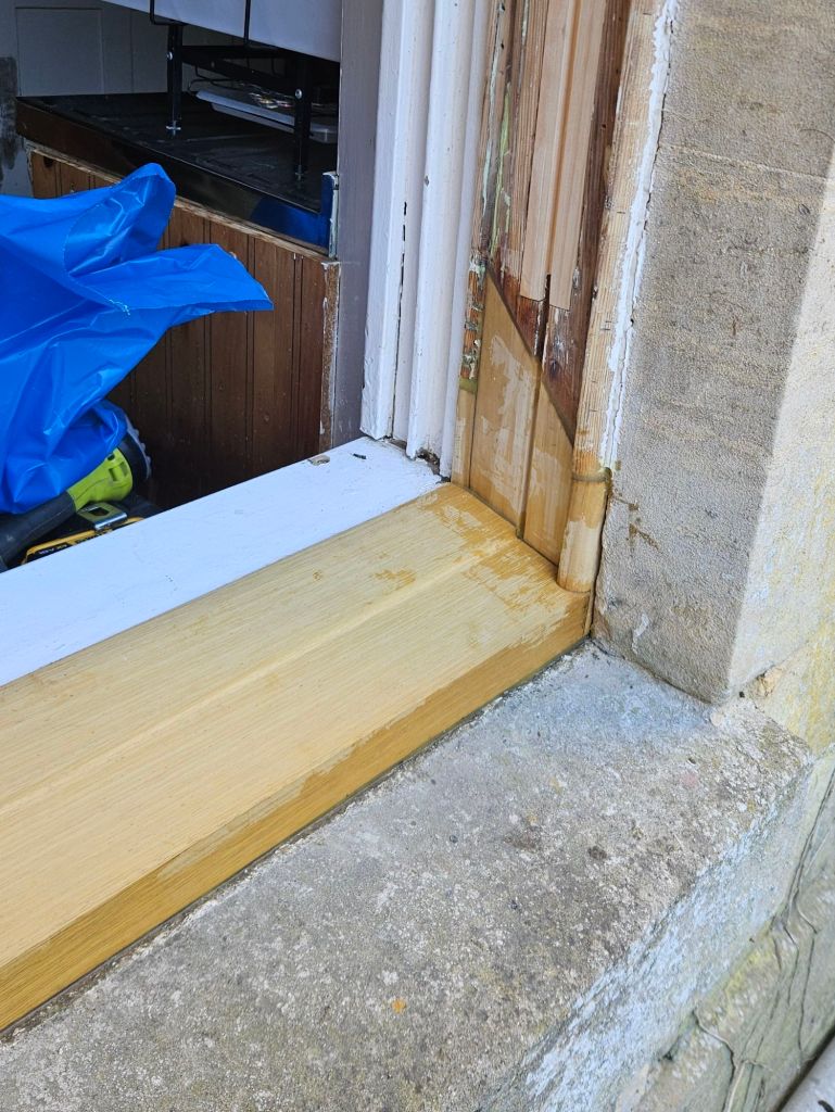 A new Iroko hardwood sill, with full cheek and stile splices using Repair Care resins for long-term durability.