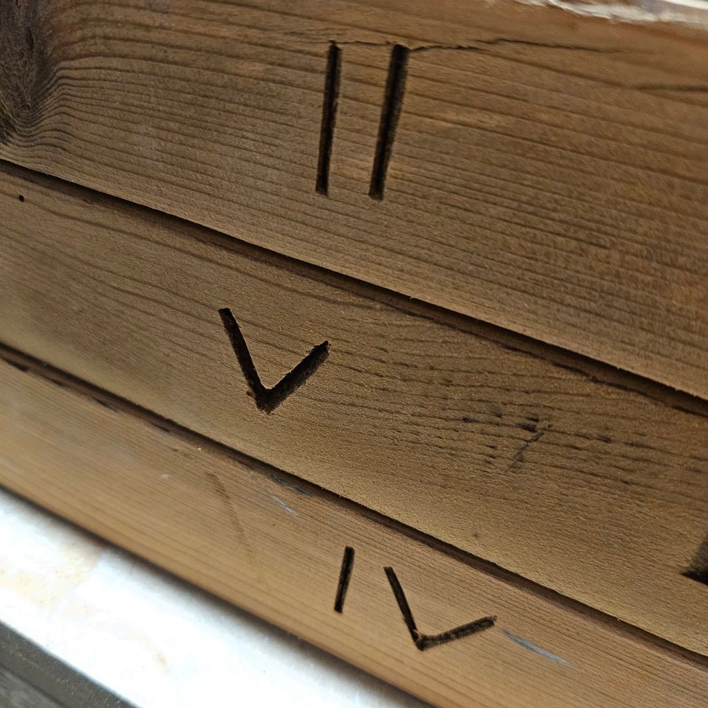 Before power tools, joiners marked sashes, shutters, and frame components with chisel-cut numerals so they could be dismantled in the workshop and reassembled on site in the exact same order.